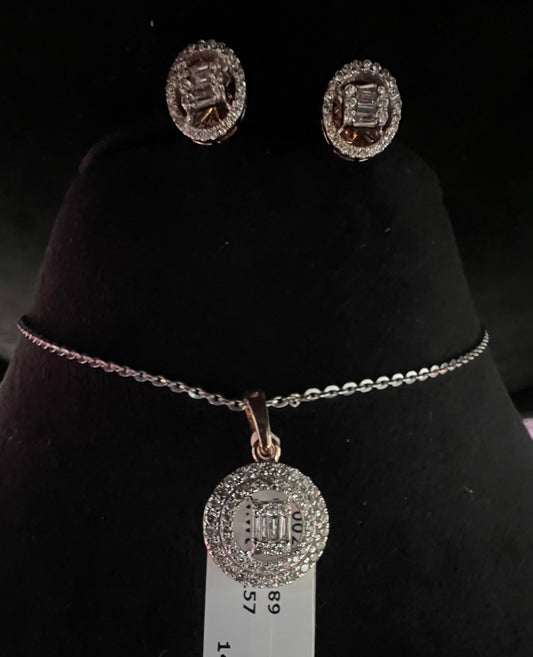 Round Halo Gold Diamond Pendant & Earrings Set with Baguette Cluster